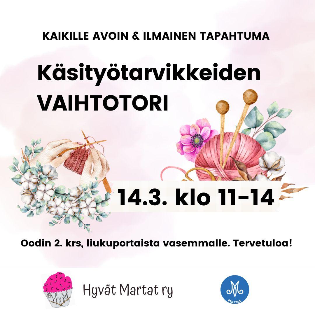 On jälleen aika kierrättää käsityötarvikkeita, kun perinteinen Hyvien Marttojen käsityötarvikkeiden vaihtotori järjestetään lauantaina 14.3. Tervetuloa torille!